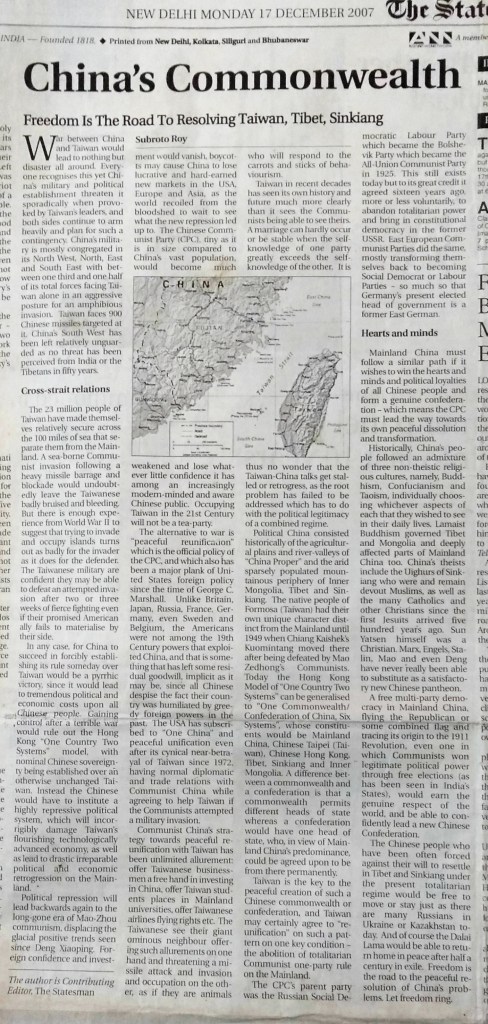“China’s Commonwealth: Freedom is the Road to Resolving Taiwan, Tibet, Sinkiang” The Statesman, December 17, 2007