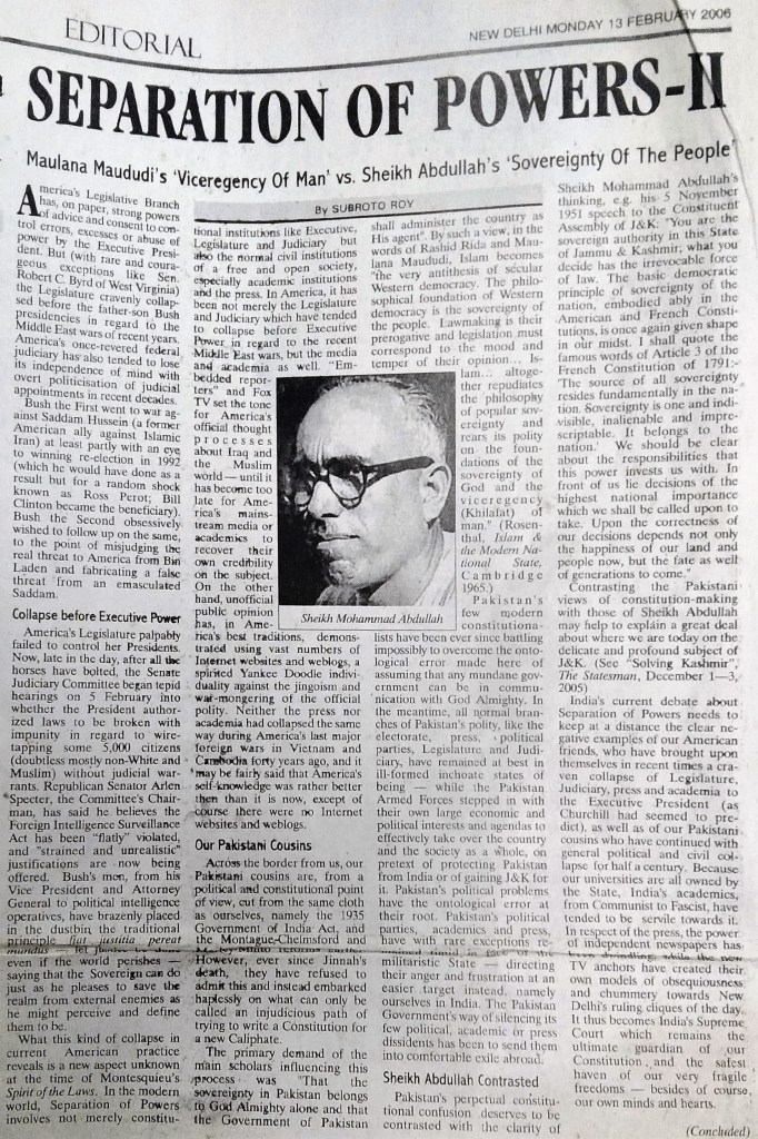 Sheikh Abdullah Contrasted Pakistan’s perpetual constitutional confusion deserves to be contrasted with the clarity of Sheikh Mohammad Abdullah’s thinking, e.g. his 5 November 1951 speech to the Constituent Assembly of J&K: “You are the sovereign authority in this State of Jammu & Kashmir; what you decide has the irrevocable force of law. The basic democratic principle of sovereignty of the nation, embodied ably in the American and French Constitutions, is once again given shape in our midst. I shall quote the famous words of Article 3 of the French Constitution of 1791:- ‘The source of all sovereignty resides fundamentally in the nation. Sovereignty is one and indivisible, inalienable and imprescriptable. It belongs to the nation.’ We should be clear about the responsibilities that this power invests us with. In front of us lie decisions of the highest national importance which we shall be called upon to take. Upon the correctness of our decisions depends not only the happiness of our land and people now, but the fate as well of generations to come.”