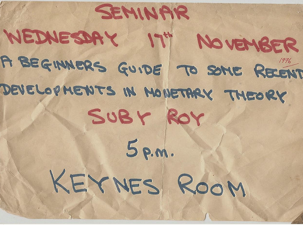 I was petrified but somehow managed to give a half-decent lecture before a standing-room only audience in what used to be called the “Keynes Room” in the Cambridge Economics Department. (It helped that a few months earlier, as a final year undergraduate at the LSE, I had been required to give a lecture at ACL Day’s Seminar on international monetary economics. It is a practice I came to follow with my students in due course, as there may be no substitute in learning how to think while standing up.) I shall try to publish exactly what I said at my Hahn-seminar when I find the document; broadly, it had to do with the crucial problem Hahn had identified a dozen years earlier in Patinkin’s work by asking what was required for the price of money to be positive in a general equilibrium, i.e. why do people everywhere hold and use money when it is intrinsically worthless. Patinkin’s utility function had real money balances appearing along with other goods; Hahn’s “On Some Problems of Proving the Existence of an Equilibrium in a Monetary Economy” in Theory of Interest Rates (1965), was the decisive criticism of this, where he showed that Patinkin’s formulation could not ensure a non-zero price for money in equilibrium. Hence Patinkin’s was a model in which money might not be held and therefore failed a vital requirement of a monetary economy. The announcement of my seminar was scribbled by a young Cambridge lecturer named Oliver Hart, later a distinguished member of MIT and Harvard University.”