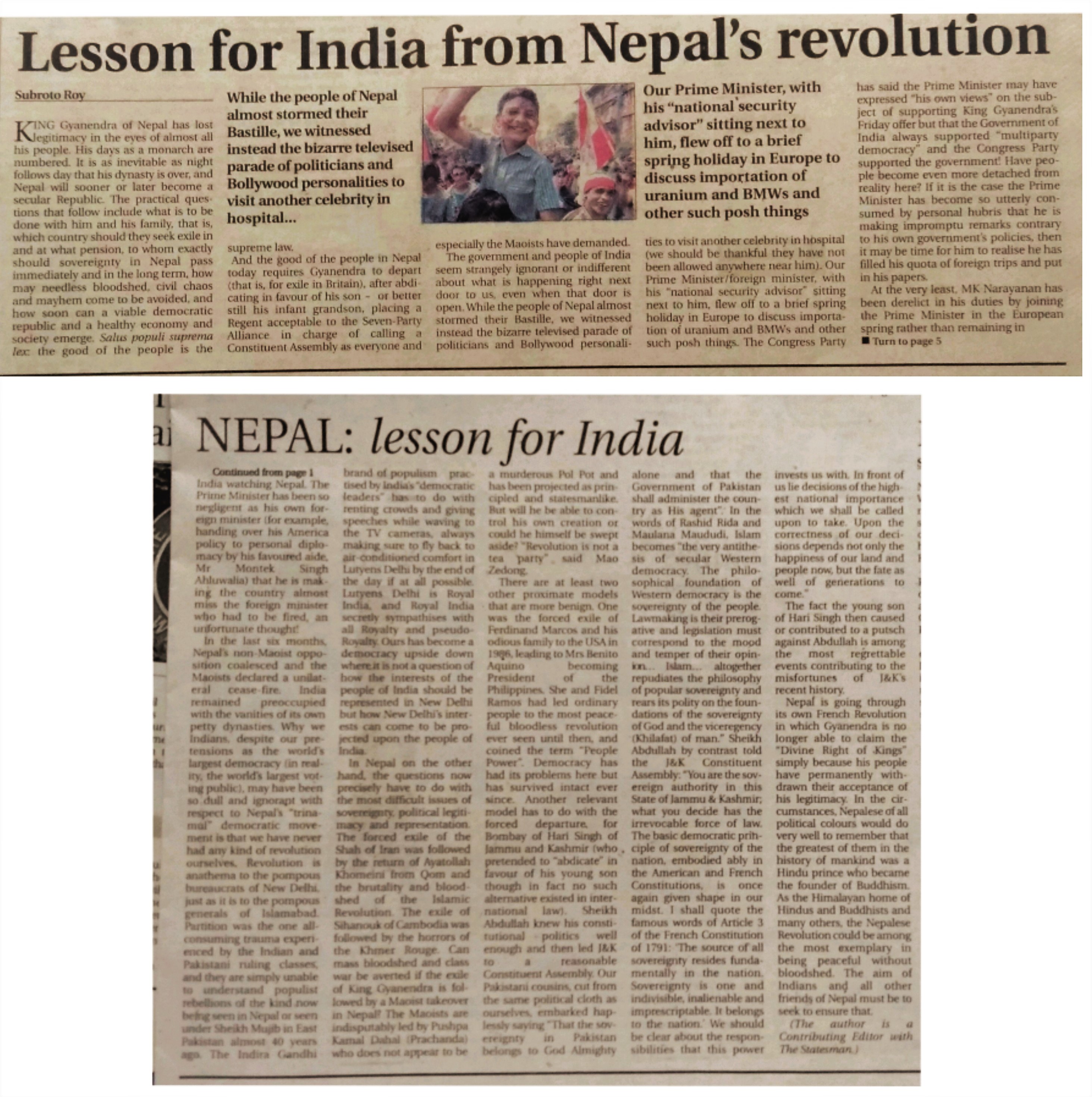 Revolution is anathema to the pompous bureaucrats of New Delhi, just as it is to the pompous generals of Islamabad. Partition was the one all-consuming trauma experienced by the Indian and Pakistani ruling classes, and they are simply unable to understand populist rebellions of the kind now being seen in Nepal or seen under Sheikh Mujib in East Pakistan almost 40 years ago. The Indira Gandhi brand of populism practised by India’s “democratic leaders” has to do with renting crowds and giving speeches while waving to the TV cameras, always making sure to fly back to air-conditioned comfort in Lutyens Delhi by the end of the day if at all possible. Lutyens Delhi is Royal India, and Royal India secretly sympathises with all Royalty and pseudo-Royalty. Ours has become a democracy upside down where it is not a question of how the interests of the people of India should be represented in New Delhi but how New Delhi’s interests can come to be projected upon the people of India.