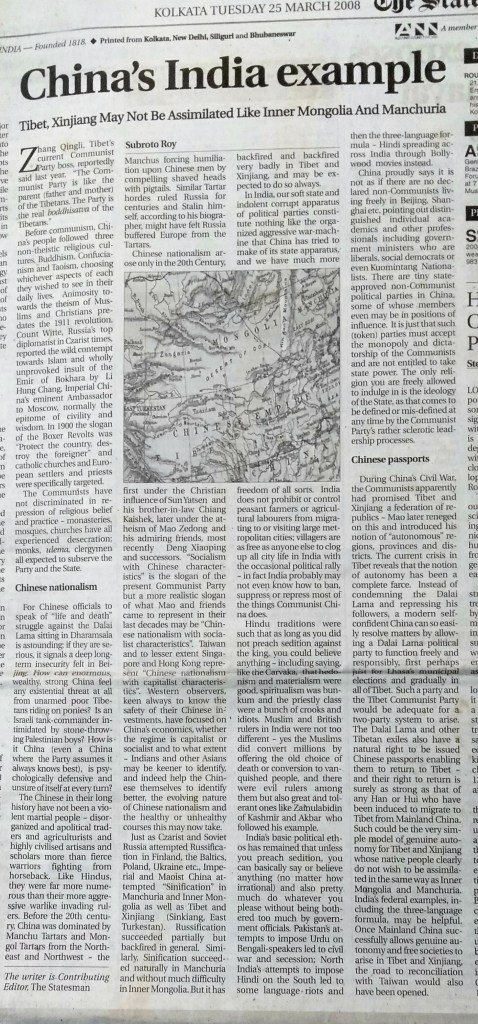 “China’s India Example: Tibet, Xinjiang May Not Be Assimilated Like Inner Mongolia, Manchuria”, The Statesman, March 25, 2008