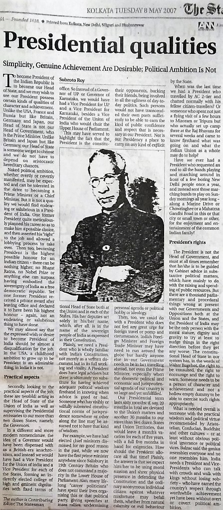 We may almost say that the expressed wish or desire to become President of India should be almost a disqualification for the job. In the USA, a childhood ambition to grow up to be President is an admirable thing; in India it is not.
