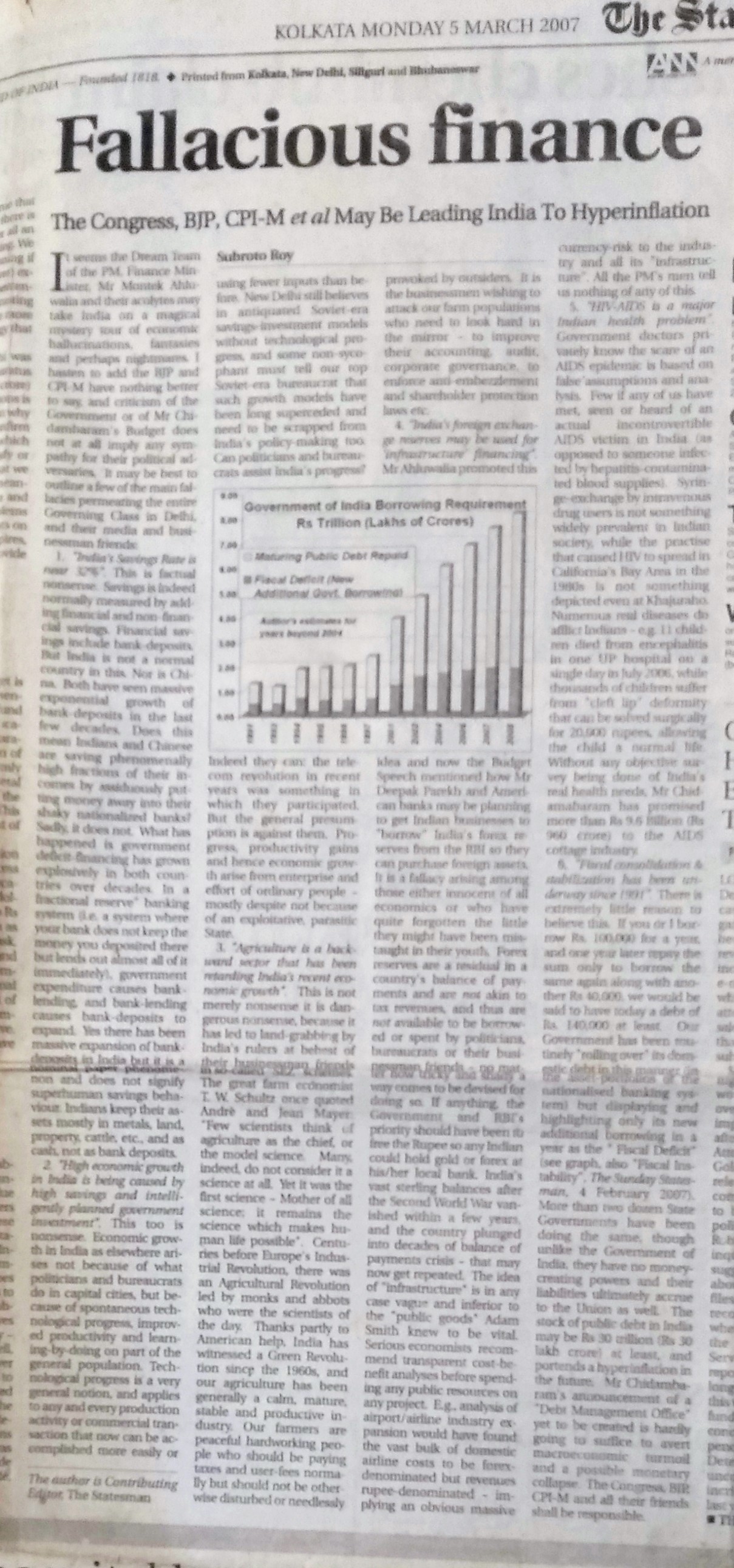 Fallacious Finance: Congress, BJP, CPI-M et al may be leading India to hyperinflation (2007)