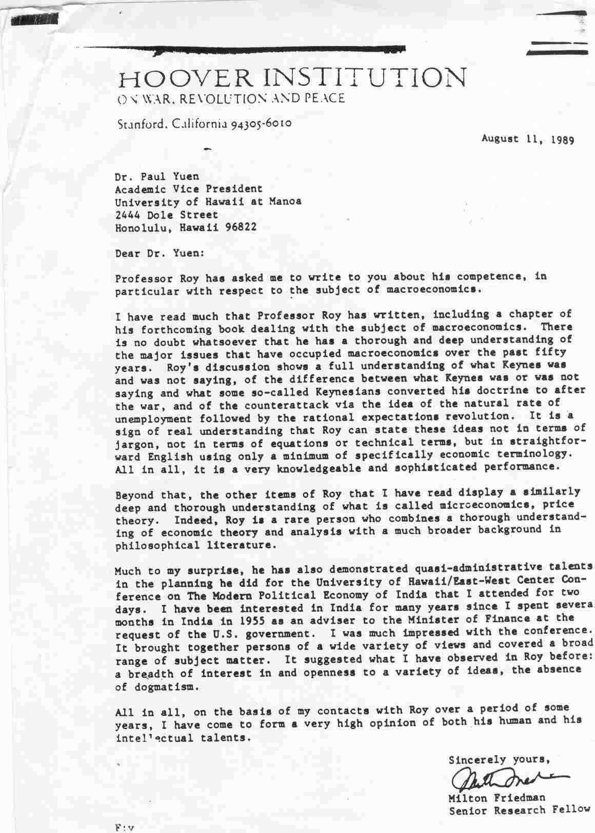 Milton Friedman’s chapter that we published for the first time was a memorandum he wrote in November 1955 for the Government of India which the GoI had effectively suppressed.  I came to know of it while a doctoral student at Cambridge under Frank Hahn, when at a conference at Oxford about 1979-1980, Peter Tamas Bauer sat me down beside him and told me the story.  Later in Blacksburg about 1981, N. Georgescu-Roegen on a visit from Vanderbilt University told me the same thing.  Specifically, Georgescu-Roegen told me that leading Indian academics had almost insulted Milton in public which Milton had borne gamely; that after Milton had given a talk in Delhi to VKRV Rao’s graduate-students,  a talk Georgescu-Roegen had been present at, VKRV Rao had addressed the students and told them in all seriousness “You have heard what Professor Friedman has to say, if you repeat what he has said in your exams, you will fail”.