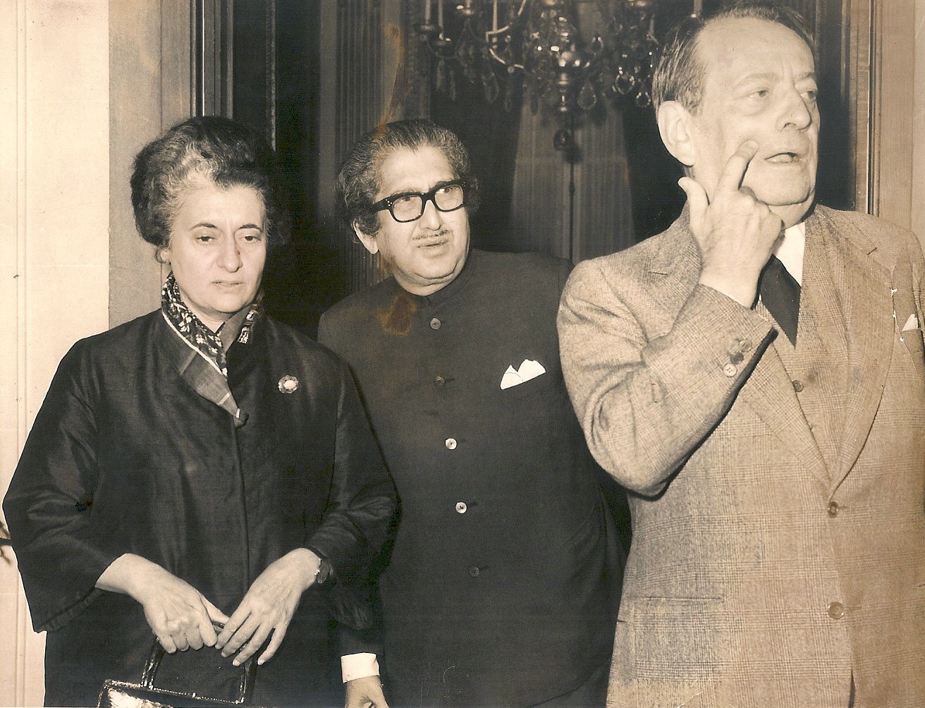 This is a photograph of Indira Gandhi emerging with Andre Malraux for a press-conference at the Embassy of India in Paris in the Autumn of 1971. (My father, pictured in the centre, had been posted to the Embassy just a few weeks earlier in anticipation of the visit. [My father recalls her asking him during or between one of these meetings, “Mr Roy, I am very hungry, can you please get me something to eat?”, and he went and grabbed a small hotel plate full of peanuts which she devoured…]) Indira was making the serious diplomatic effort that she did in world capitals to avert war with West Pakistan over its atrocities in East Pakistan. War could not be averted and within a few weeks, in December 1971, Bangladesh was born.