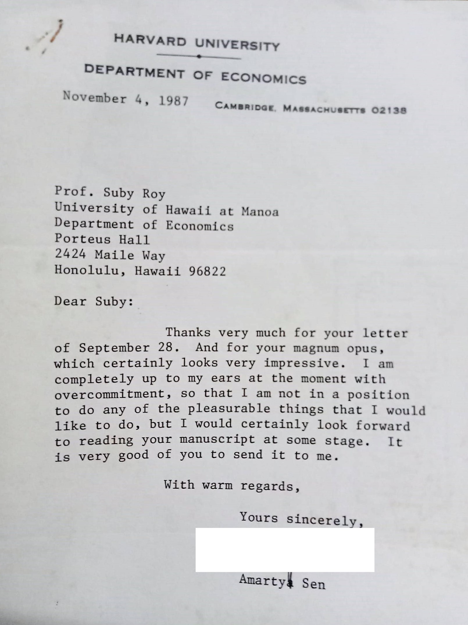 The last letter I have from Amartya is from Harvard to Honolulu in 1987, and said he had put the manuscript of my book on the back-burner.