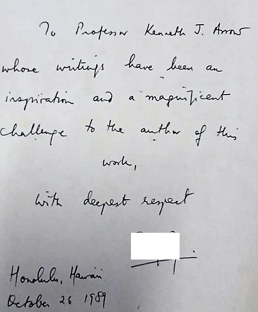 My inscription praised Arrow’s work (from which I had learnt so much in its market theory aspects) and said I had always seen it as a scientific challenge. [Uploading the inscription today 29 September 2021, I find the words “inspiration and magnificent challenge” not “scientific challenge” as I remembered it, and also mean now.]