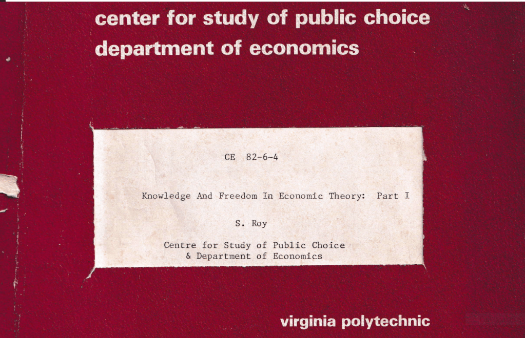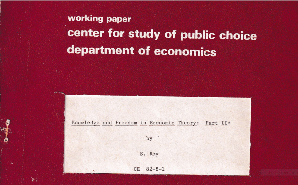 Arrow’s 17 year collaboration with Frank Hahn that resulted in General Competitive Analysis was known to me, and Hahn had paid me fifty pounds sterling back in 1976/1977 to proof-read it for a second edition. Arrow and I had met briefly in the early 1980s at an American Economic Association meeting, and I had sent him in 1982 “Knowledge and Freedom in Economic Theory Parts I and II”, a discussion paper I had published with Jim Buchanan’s Center for Study of Public Choice, now made freely available: